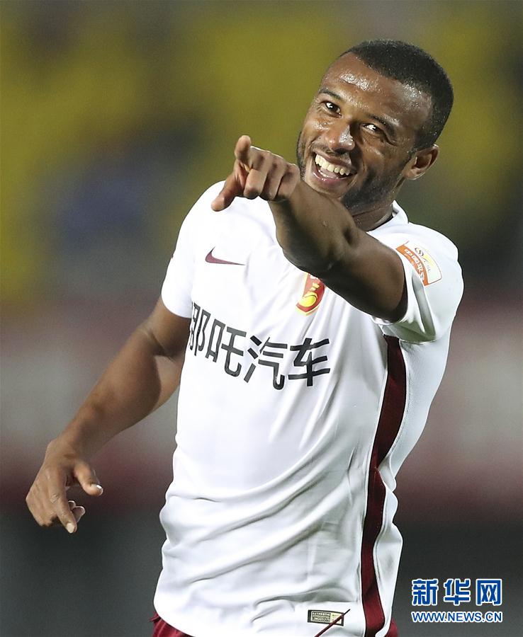 图为9月16日,河北华夏幸福队球员卡埃比庆祝进球。 新华社记者曹灿摄