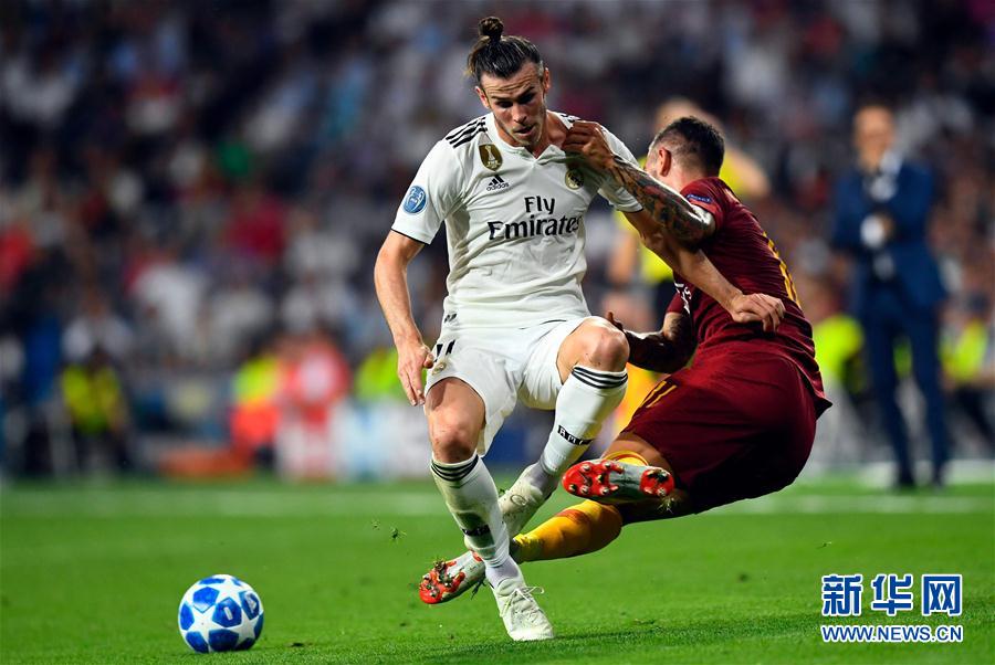 9月19日,皇家马德里队球员贝尔(左)与罗马队球员科拉罗夫拼抢。 当日,在2018-2019赛季欧洲足球冠军联赛G组的一场比赛中,西甲豪门皇家马德里队主场以3比0战胜意甲罗马队。 新华社/法新