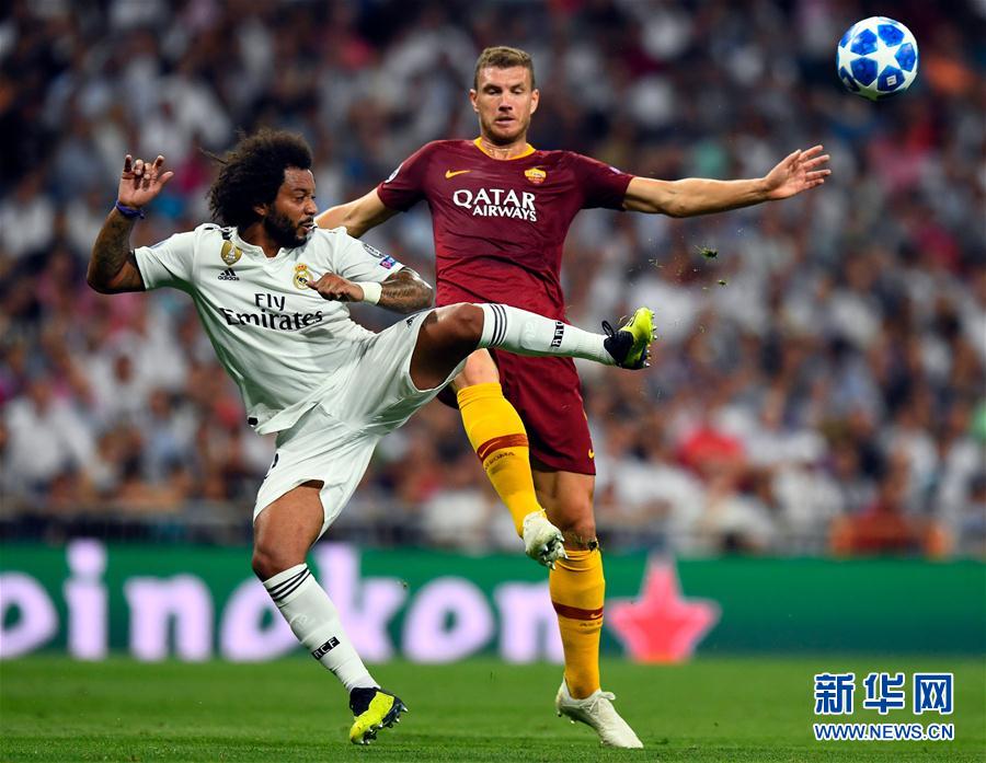 9月19日,皇家马德里队球员马塞洛(左)与罗马队球员科拉罗夫拼抢。 当日,在2018-2019赛季欧洲足球冠军联赛G组的一场比赛中,西甲豪门皇家马德里队主场以3比0战胜意甲罗马队。 新华社/法新