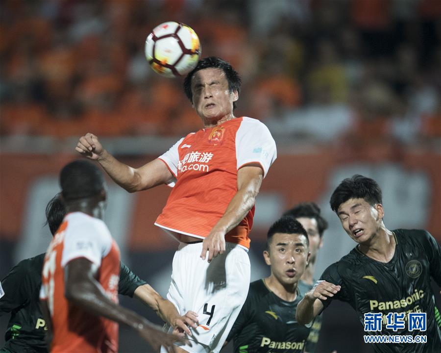 9月19日,武汉卓尔队球员艾志波(上)在比赛中争顶。 当日,在2018赛季中甲联赛第24轮比赛中,武汉卓尔队主场以1比0战胜浙江绿城队。 新华社记者肖艺九摄