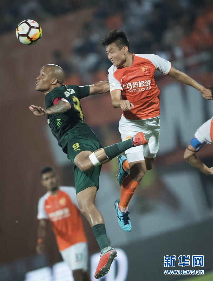 9月19日,武汉卓尔队球员李超(右)在比赛中与浙江绿城队球员迪诺争顶。 新华社记者肖艺九摄