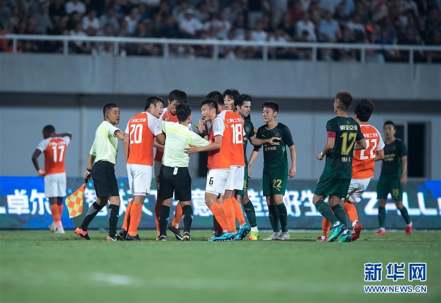9月19日,武汉卓尔队球员与浙江绿城队球员在比赛中发生争执。 新华社记者熊琦摄