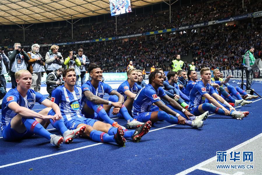 9月28日,柏林赫塔队球员在比赛后与球迷一同庆祝胜利。 新华社记者单宇琦摄