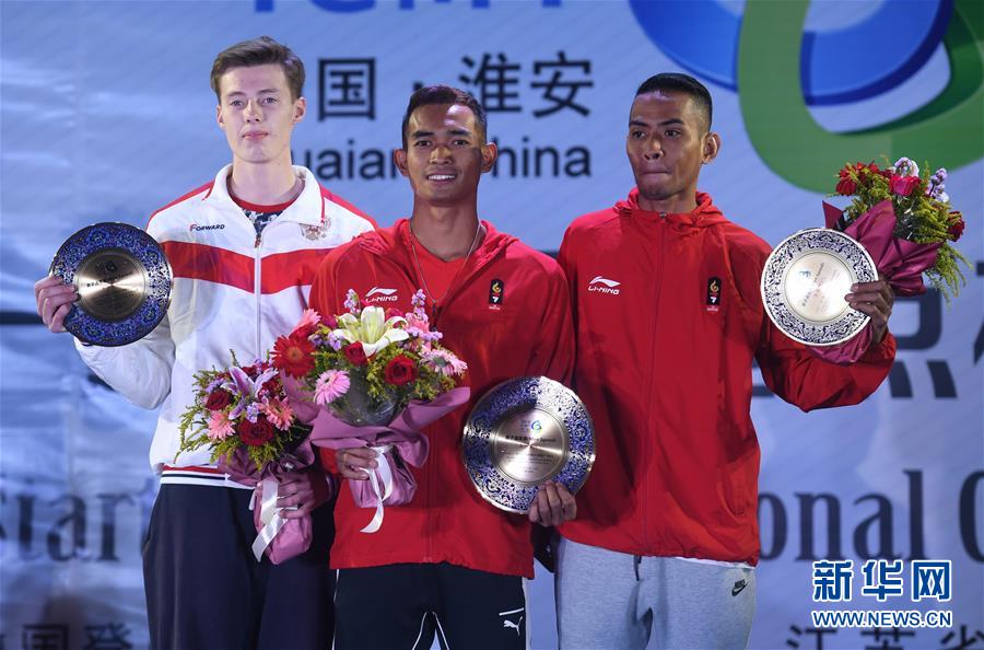 10月10日,男子速度赛冠军印度尼西亚选手维博沃(中)、亚军俄罗斯选手谢尔盖、季军印度尼西亚选手萨布里在颁奖仪式上。 当日,2018“一带一路”新起点杯国际攀岩大师赛男子速度决赛颁奖仪式在江苏淮安举行。 新华社记者季春鹏摄