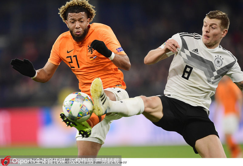 人民网北京11月20日电 北京时间11月20日3时45分,欧洲国家联赛A1组在盖尔森基兴开始最后1场较量,提前降级的德国主场2比2被荷兰逼平,史上第2次连续5场正式比赛不胜。韦尔纳终结751分钟国家队进球荒,上一场对俄罗斯打进处子球的萨内再度破门。终场前,边锋普罗梅斯和队长范戴克连下两城追平,帮助荷兰以相互交锋的优势压过法国挺进4强决赛圈。