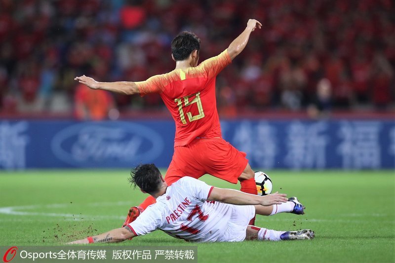 第36分钟,国足后场断球发动快速反击,武磊中路带球突破后分球到右路,金敬道停球过大,巴勒斯坦回防到位,及时将球断下。