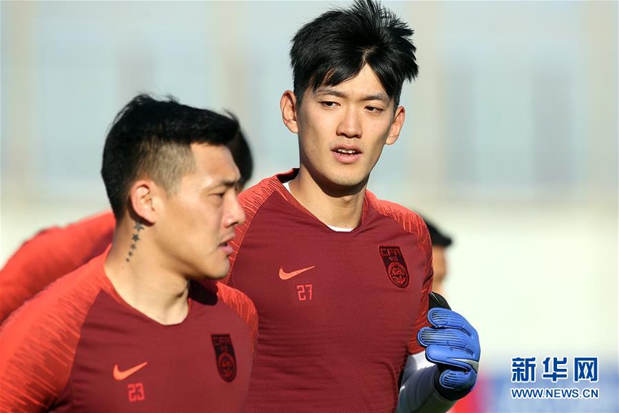 ↑1月3日,中国国家男子足球队守门员颜骏凌(右)在训练中。新华社发(马哈茂德·哈立德摄)