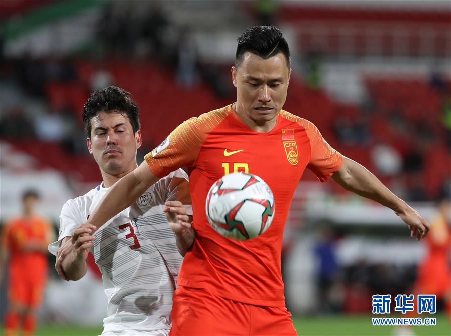 1月11日,中国队球员郜林(前)与菲律宾队球员卡利·德穆尔加在比赛中拼抢。 当日,在阿联酋阿布扎比举行的2019年亚洲杯足球赛C组小组赛中,中国队以3比0战胜菲律宾队,提前小组出线。 新华社记者 李钢 摄