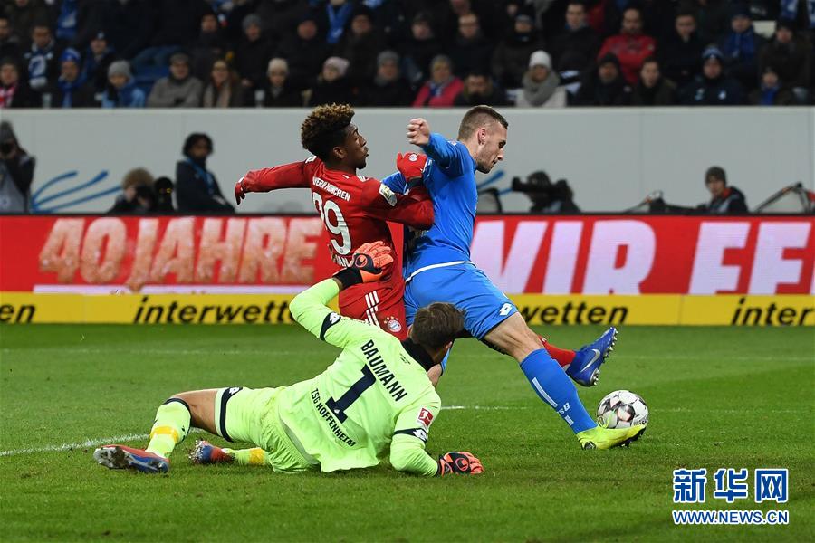 ↑1月18日,拜仁慕尼黑队球员科曼(中上)在比赛中与霍芬海姆队球员卡德扎贝克(右)、守门员鲍曼拼抢。 当日,在2018-2019赛季德国足球甲级联赛第18轮比赛中,拜仁慕尼黑队客场以3比1战胜霍芬海姆队。 新华社发(乌尔里希·胡夫纳格尔摄)