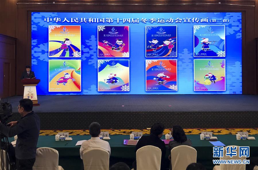2月16日,这是在发布会现场发布的“十四冬”宣传画。 当日,中华人民共和国第十四届冬季运动会倒计时一周年新闻发布会在内蒙古自治区呼伦贝尔市举行。 新华社记者许畅摄
