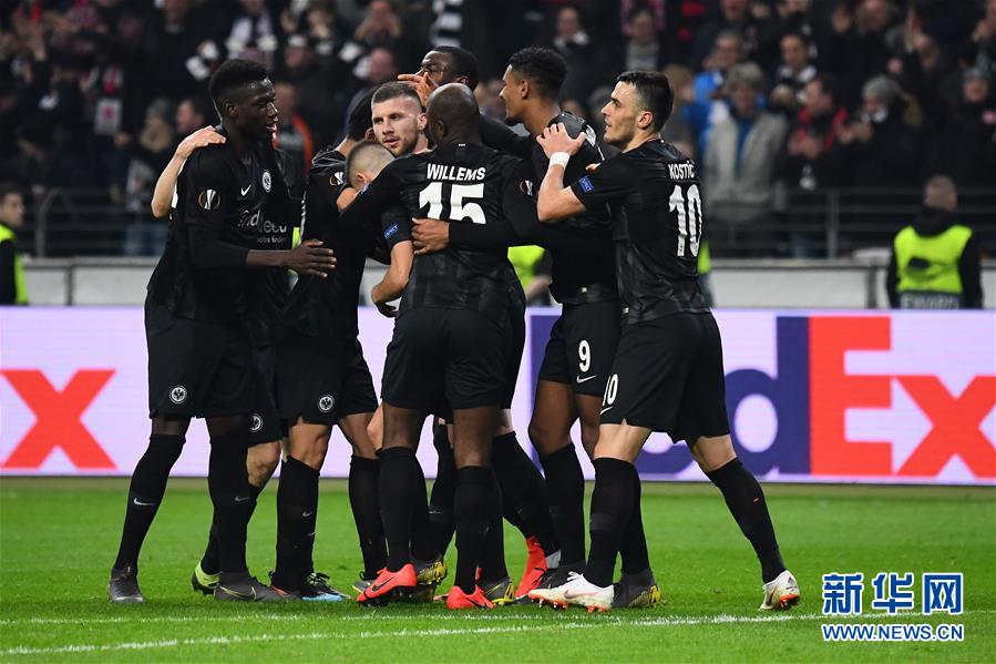 法兰克福队球员在比赛中庆祝进球。新华社发
