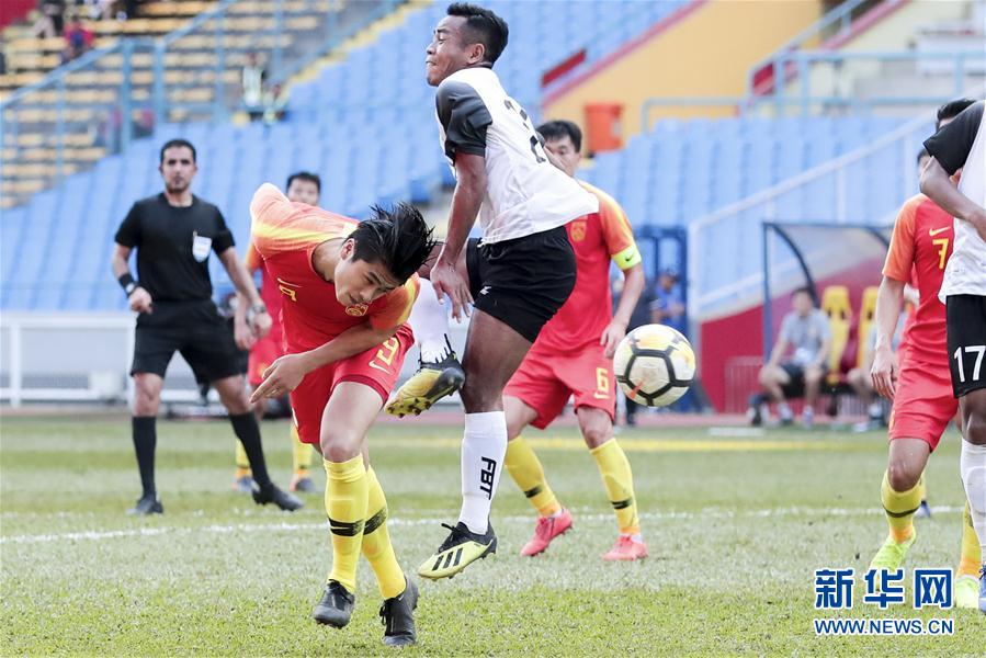 3月22日,中国队球员张玉宁(前左)在比赛中头球进攻。 当日,在马来西亚沙阿兰体育场举行的2020年U23亚锦赛预选赛暨东京奥运会第一阶段预选赛东亚区J组比赛中,中国国奥队以5比0击败老挝队。 新华社记者朱炜摄