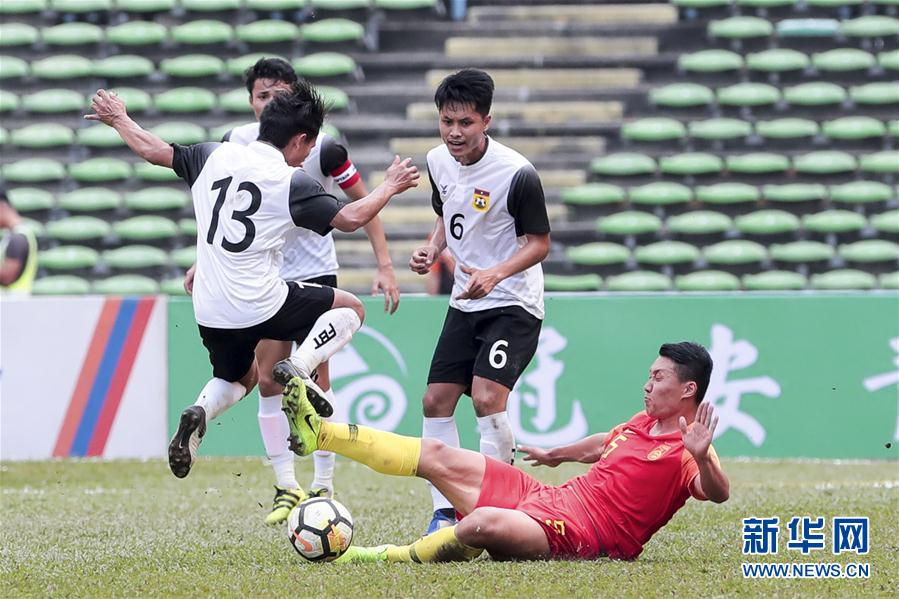 3月22日,中国队球员李扬(下)在比赛中拼抢。 当日,在马来西亚沙阿兰体育场举行的2020年U23亚锦赛预选赛暨东京奥运会第一阶段预选赛东亚区J组比赛中,中国国奥队以5比0击败老挝队。 新华社记者朱炜摄
