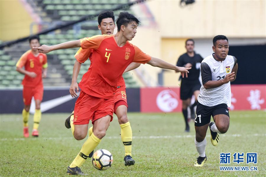 3月22日,中国队球员蒋圣龙(前)在比赛中带球。 当日,在马来西亚沙阿兰体育场举行的2020年U23亚锦赛预选赛暨东京奥运会第一阶段预选赛东亚区J组比赛中,中国国奥队以5比0击败老挝队。 新华社发(张纹综摄)