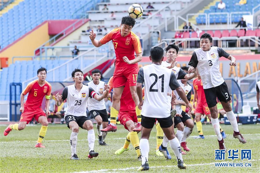 3月22日,中国队球员杨立瑜(上)在比赛中争顶头球。 当日,在马来西亚沙阿兰体育场举行的2020年U23亚锦赛预选赛暨东京奥运会第一阶段预选赛东亚区J组比赛中,中国国奥队以5比0击败老挝队。 新华社记者朱炜摄