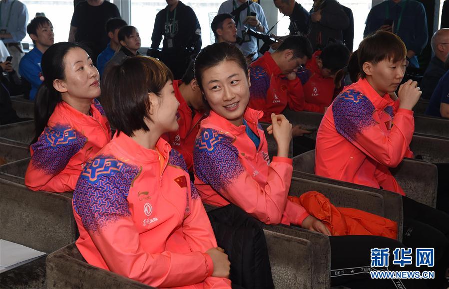 4月20日,丁宁(中)和陈梦、王曼昱(右)在抽签仪式上。 当日,2019年世界乒乓球锦标赛单项赛举行单打抽签仪式。 新华社记者陶希夷摄