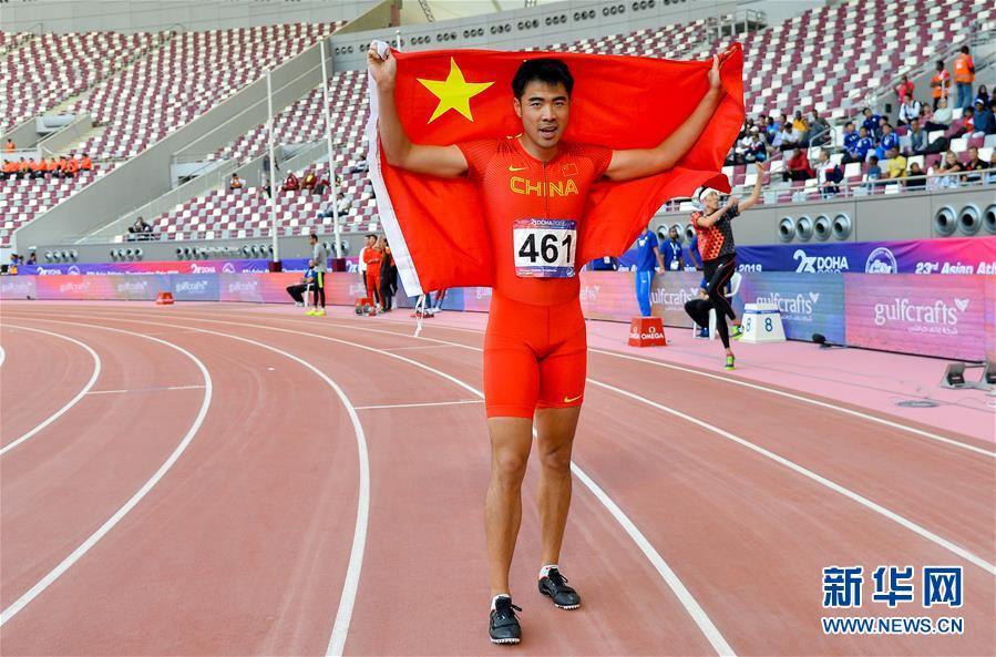4月24日,中国选手谢文骏在夺冠后庆祝。 当日,在多哈举行的第23届亚洲田径锦标赛男子110米栏决赛中,中国选手谢文骏以13秒21的成绩打破赛会纪录并夺得冠军。 新华社发(尼库摄)