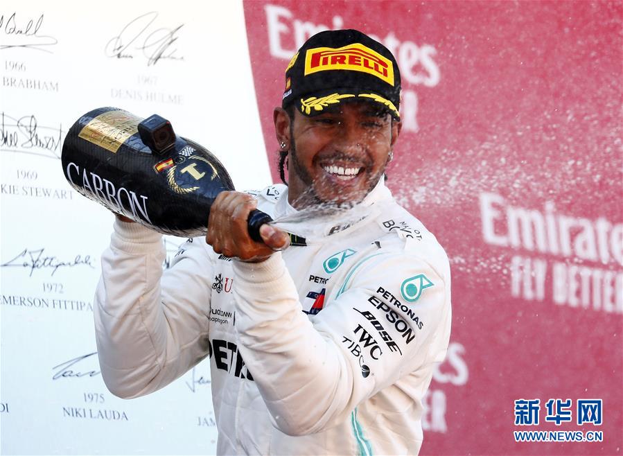 5月12日,汉密尔顿喷洒香槟庆祝夺冠。 当日,在西班牙巴塞罗那举行的2019年世界一级方程式赛车锦标赛(F1)大奖赛西班牙站比赛中,梅赛德斯车队英国车手汉密尔顿夺得冠军,他的队友博塔斯名列第二,红牛车队德国车手维斯塔潘获得第三名。 新华社/路透