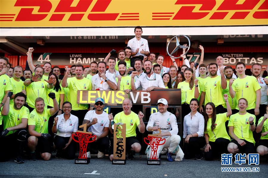 汉密尔顿(第一排,左四),博塔斯(第一排,右四)赛后与工作人员合影。 新华社/路透