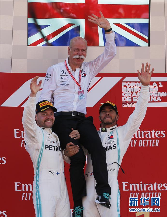 汉密尔顿(右)、博塔斯(左)在颁奖仪式上举起德国戴姆勒集团董事长蔡澈庆祝。 新华社/路透