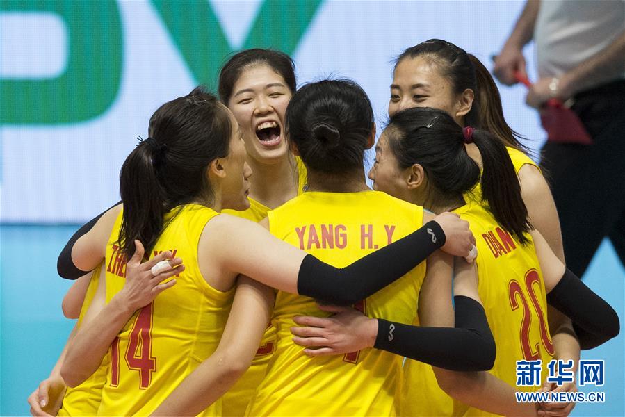 5月14日,中国队球员庆祝胜利。 当日,在瑞士蒙特勒举行的2019年瑞士女排精英赛小组赛中,中国队以3比2战胜德国队。 新华社记者徐金泉摄