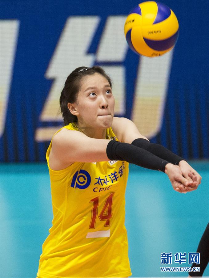 5月14日,中国队球员郑益昕(左)在比赛中传球。 当日,在瑞士蒙特勒举行的2019年瑞士女排精英赛小组赛中,中国队以3比2战胜德国队。 新华社记者徐金泉摄