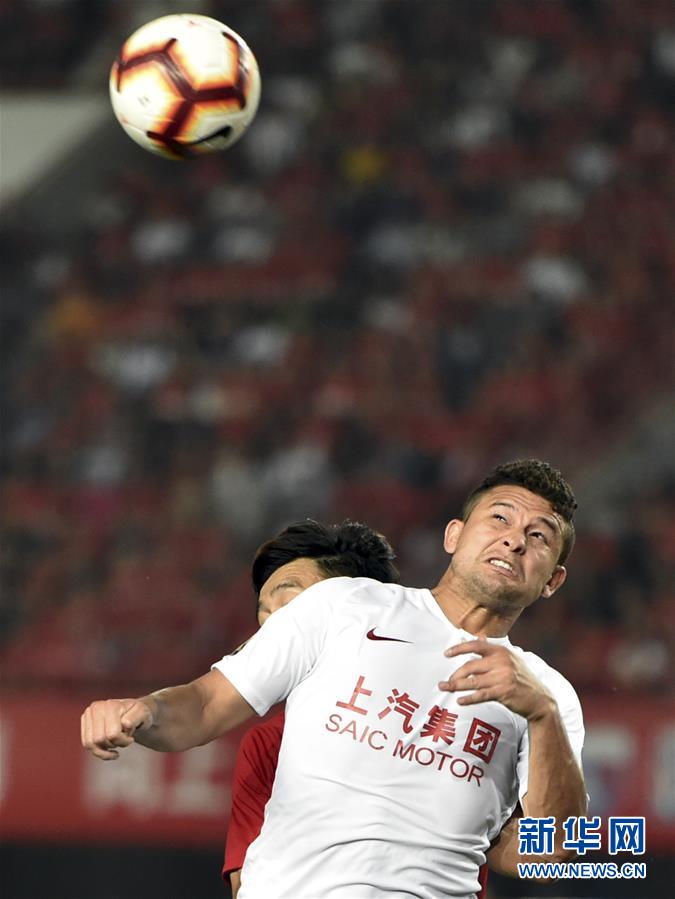 图为上海上港队球员埃尔克森(前左)在比赛中争顶头球。 新华社记者李嘉南摄