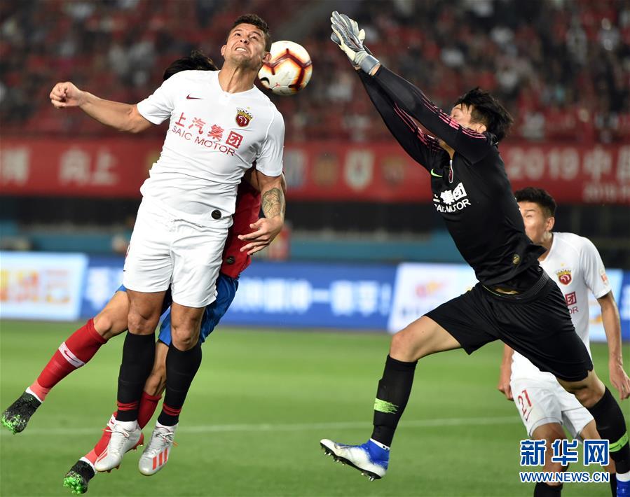 5月17日,中超联赛第10轮上海上港队主场迎战河南建业队。本场比赛双方核心均高挂免战牌,上海上港队的胡尔克和河南建业队的伊沃缺阵。全场唯一的进球来自上半场第33分钟,上海上港队外援艾哈迈多夫边路传中,于海底线回做,胡靖航头球摆渡,埃尔克森门前机敏抢射,为客队一锤定音。 图为上海上港队球员埃尔克森(前)在比赛中争顶头球。 新华社记者李嘉南摄