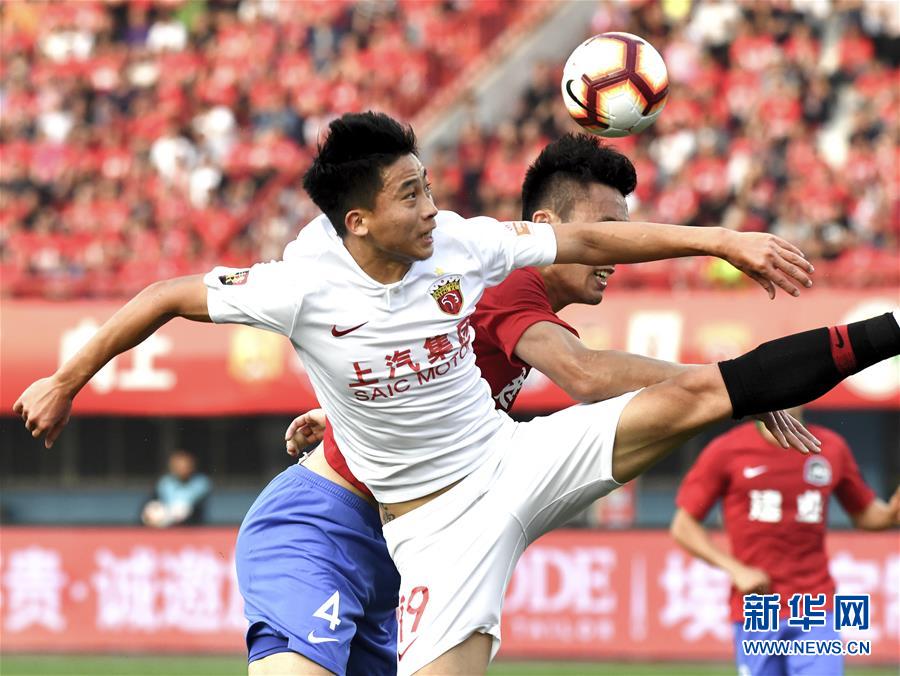 图为上海上港队球员胡靖航(前)在比赛中争抢头球。 新华社记者李嘉南摄