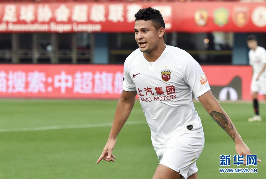 图为上海上港队球员埃尔克森在比赛中庆祝进球。 新华社记者李嘉南摄