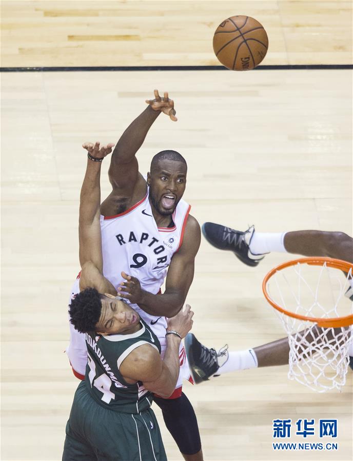 5月21日,猛龙队球员伊巴卡(上)在比赛中上篮。 当日,在2018-2019赛季NBA季后赛东部决赛第四场比赛中,多伦多猛龙队主场以120比102战胜密尔沃基雄鹿队,将总比分扳为2比2。 新华社发(邹峥摄)