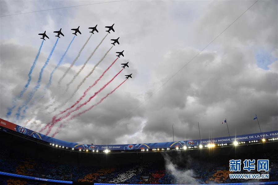6月7日,在法国巴黎,“法兰西巡逻兵”特技飞行表演队飞过王子公园球场上空。 当日,2019年国际足联女足世界杯在法国巴黎王子公园球场开幕。 新华社记者 陈益宸 摄