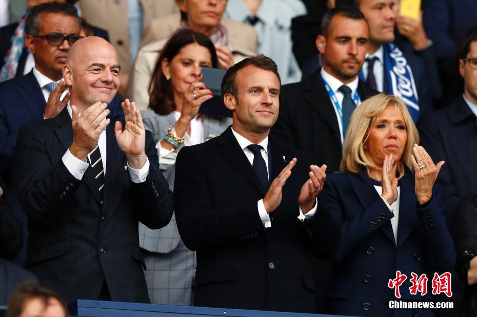 当地时间6月7日,2019年法国女足世界杯在巴黎开幕。图为法国总统马克龙及夫人布丽吉特与国际足联主席因凡蒂诺出席开幕式,并观看揭幕战比赛。中新社记者 富田 摄