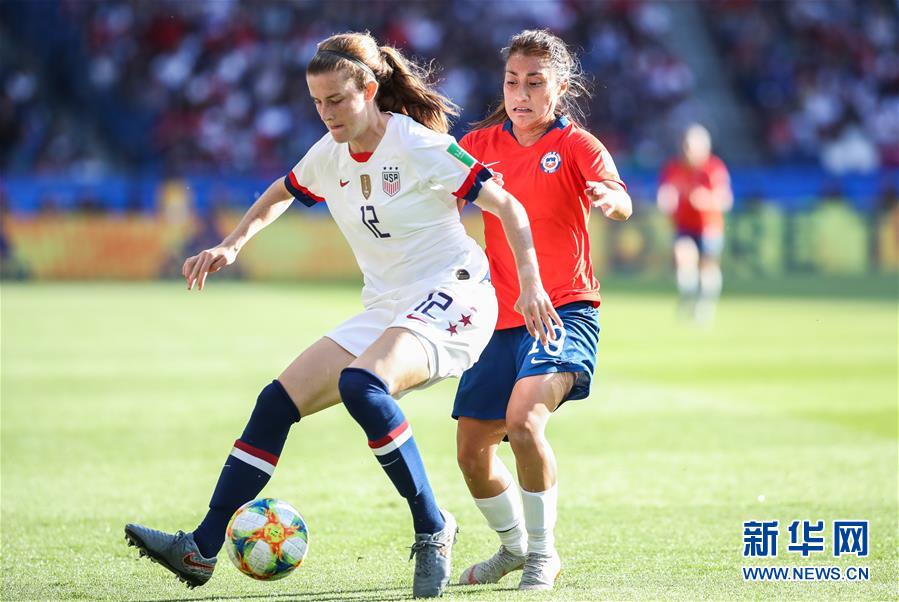 6月16日,美国队球员戴维森(左)与智利队球员胡安特奥在比赛中拼抢。 当日,在法国巴黎王子公园球场举行的2019年国际足联女足世界杯F组小组赛中,美国队以3比0战胜智利队。 新华社记者单宇琦摄