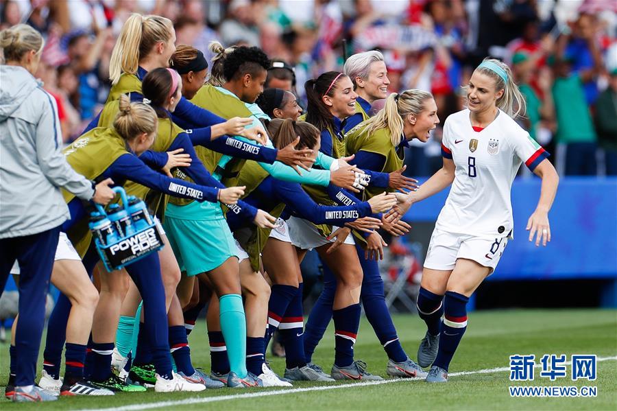 6月16日,美国队球员埃尔茨(右一)与替补席上的队友击掌庆祝打进本场比赛第二粒进球。 当日,在法国巴黎王子公园球场举行的2019年国际足联女足世界杯F组小组赛中,美国队以3比0战胜智利队。 新华社记者郑焕松摄
