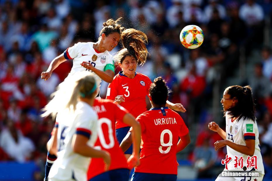 当地时间6月16日,美国队球员劳埃德(左)在比赛中争抢头球。当日,在法国巴黎举行的2019年国际足联女足世界杯F组小组赛中,美国队以3比0战胜智利队。 中新社记者 富田 摄