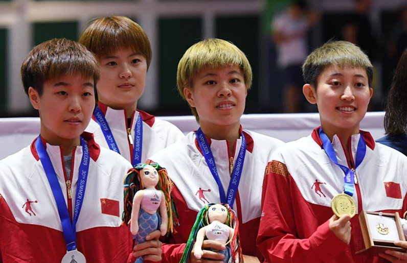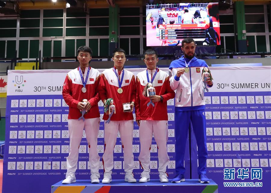 7月11日,中国队选手赵子豪、于子洋、朱霖峰、俄罗斯选手伊斯梅洛夫(从左至右)在颁奖仪式上。 当日,在意大利那不勒斯举行的第30届世界大学生夏季运动会乒乓球男单决赛中,中国队选手于子洋以4比0战胜队友赵子豪,获得金牌,赵子豪获得银牌。中国队选手朱霖峰与俄罗斯选手伊斯梅洛夫获得铜牌。 新华社记者程婷婷摄