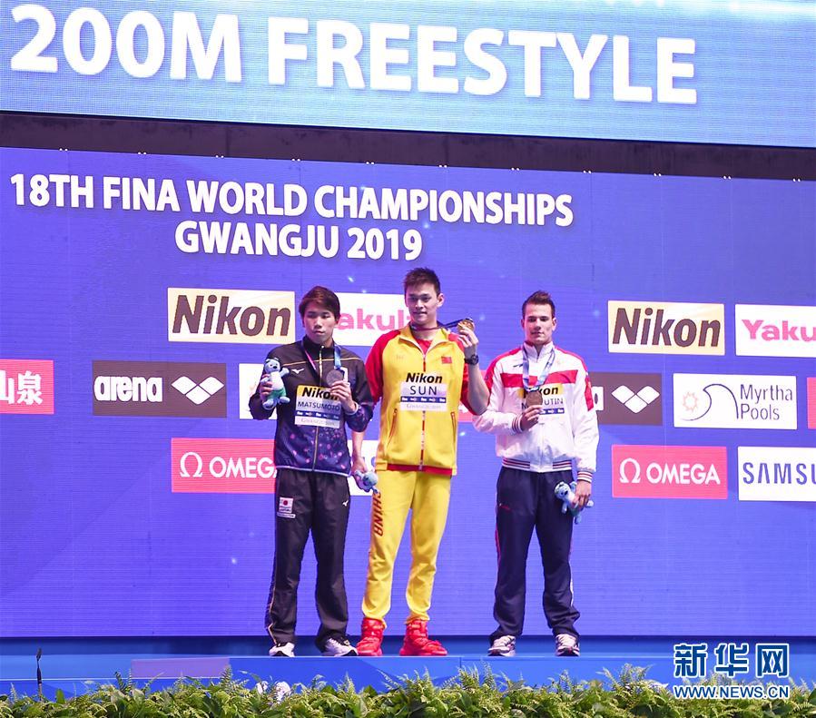 7月23日,获得金牌的中国选手孙杨(中)、获得银牌的日本选手松元克央(左)与获得铜牌的俄罗斯选手马柳京在颁奖仪式上合影。 当日,在韩国光州举行的2019国际泳联世界游泳锦标赛男子200米自由泳决赛中,中国选手孙杨以1分44秒93的成绩获得冠军,日本选手松元克央以1分45秒22的成绩获得亚军,俄罗斯选手马柳京和英国选手斯科特以1分45秒63的成绩并列季军。 新华社记者夏一方摄