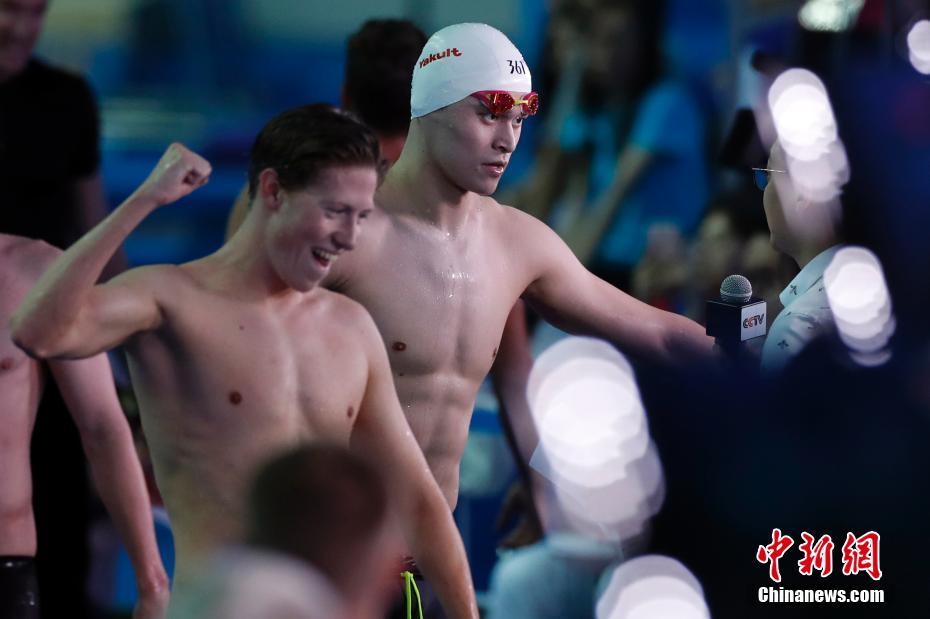 7月24日,孙杨(后)比赛结束后接受采访。当日,在韩国光州举行的2019国际泳联世界游泳锦标赛男子800米自由泳决赛中,中国选手孙杨以7分45秒01的成绩获得第六名。中新社记者 韩海丹 摄