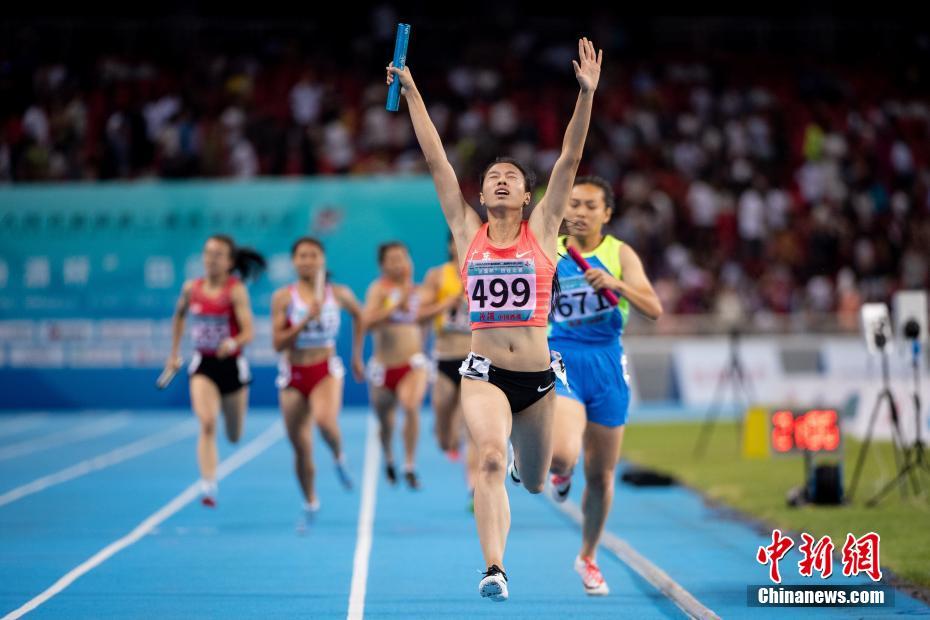 8月17日,山西省太原市,在中国第二届青年运动会体校甲组女子4×200米接力决赛,广东队第四棒选手朱翠妍庆祝本队获得冠军。中新社记者 韦亮 摄