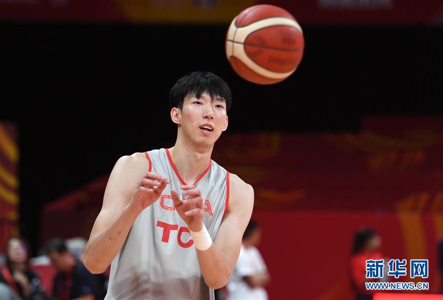 8月30日,中国队球员周琦在训练中。 当日,中国队在五棵松体育馆进行训练并举行赛前新闻发布会。中国队的本届男篮世界杯首战将于8月31日进行。 新华社记者张晨霖摄