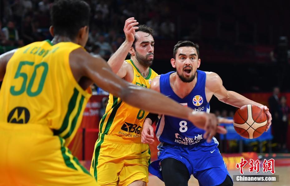 9月7日下午,在深圳进行的2019年国际篮联篮球世界杯第二轮K组的一场比赛中,捷克队(蓝) 93比71 战胜巴西队(黄)。图为捷克队8号球员 T.SATORANSKY (萨托兰斯基)控球进攻。中新社记者 陈文 摄