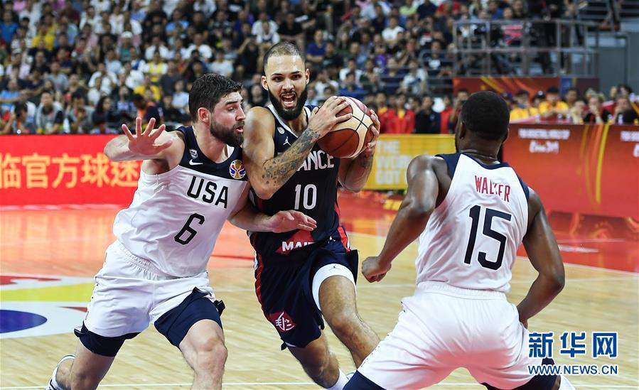 9月11日,法国队球员富尼耶(中)在比赛中突破美国队球员哈里斯(左)的防守。 当日,在广东东莞举行的2019年国际篮联篮球世界杯四分之一决赛中,美国队以79比89不敌法国队,无缘半决赛。 新华社记者薛玉斌摄