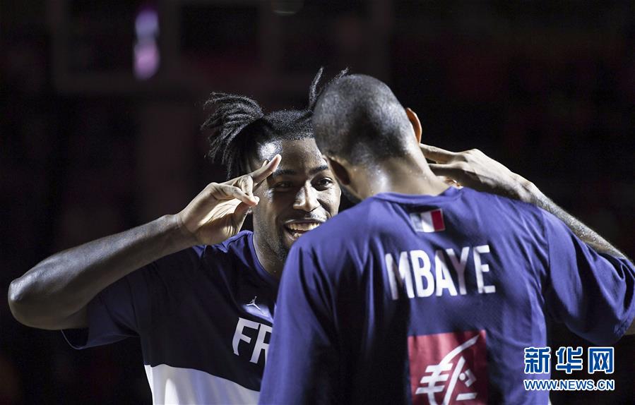 9月11日,法国队球员莱索尔(左)在比赛开场前与队友姆巴耶互动。 当日,在广东东莞举行的2019年国际篮联篮球世界杯四分之一决赛中,美国队以79比89不敌法国队,无缘半决赛。 新华社记者薛玉斌摄