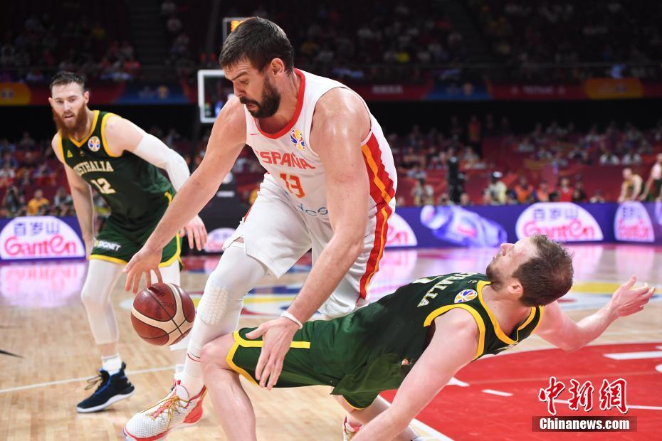 9月13日,2019男篮世界杯半决赛在北京进行,西班牙队通过两个加时,最终以95比88战胜澳大利亚队,进军决赛。图为西班牙队球员加索尔(中)在比赛中。中新社记者 崔楠 摄