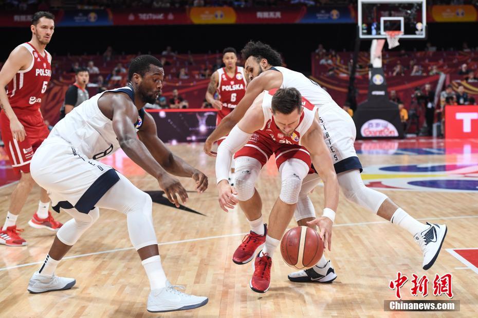 9月14日,在北京举行的2019年国际篮联篮球世界杯7至8名排位赛中,美国队以87比74战胜波兰队,获得本届世界杯第七名。图为双方球员在比赛中抢球。中新社记者 崔楠 摄