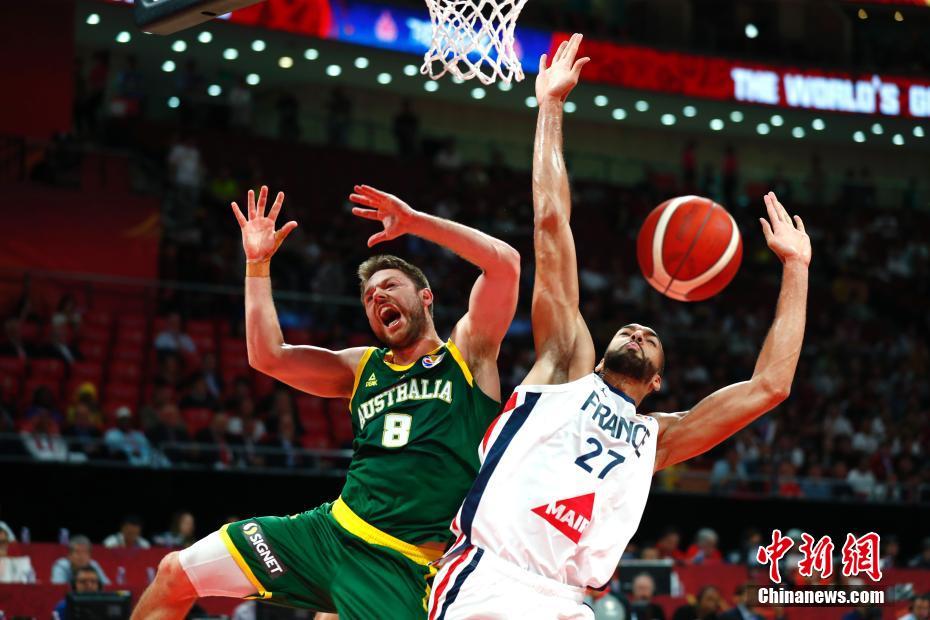 9月15日,法国球员戈贝尔(右)在比赛中拼抢。当日,在北京进行的2019年国际篮联篮球世界杯季军争夺战中,法国队67:59战胜澳大利亚队,摘得铜牌。中新社记者 富田 摄
