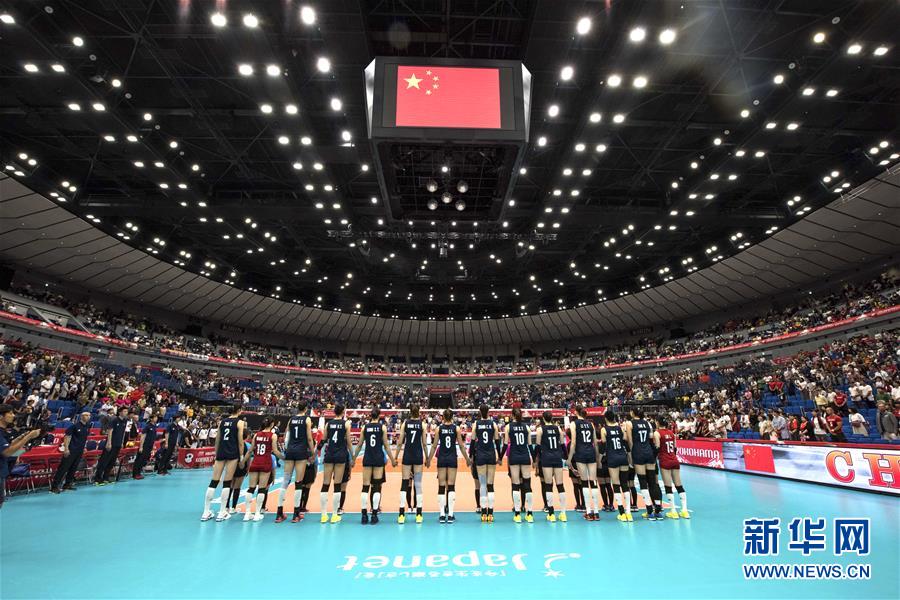 9月16日,中国队球员在比赛前唱国歌。 当日,在日本横滨举行的2019年女排世界杯赛第一阶段A组循环赛比赛中,中国队以3比0战胜俄罗斯队。 新华社记者朱炜摄