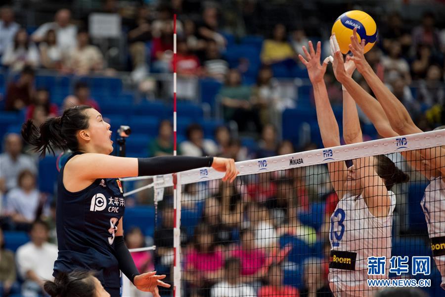 9月16日,中国队球员张常宁(左)在比赛中扣球。 当日,在日本横滨举行的2019年女排世界杯赛第一阶段A组循环赛比赛中,中国队以3比0战胜俄罗斯队。 新华社记者朱炜摄