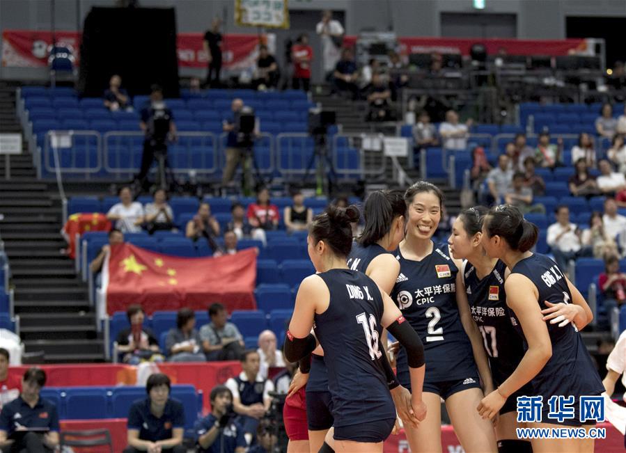 9月16日,中国队球员在比赛中庆祝得分。 当日,在日本横滨举行的2019年女排世界杯赛第一阶段A组循环赛比赛中,中国队以3比0战胜俄罗斯队。 新华社记者朱炜摄